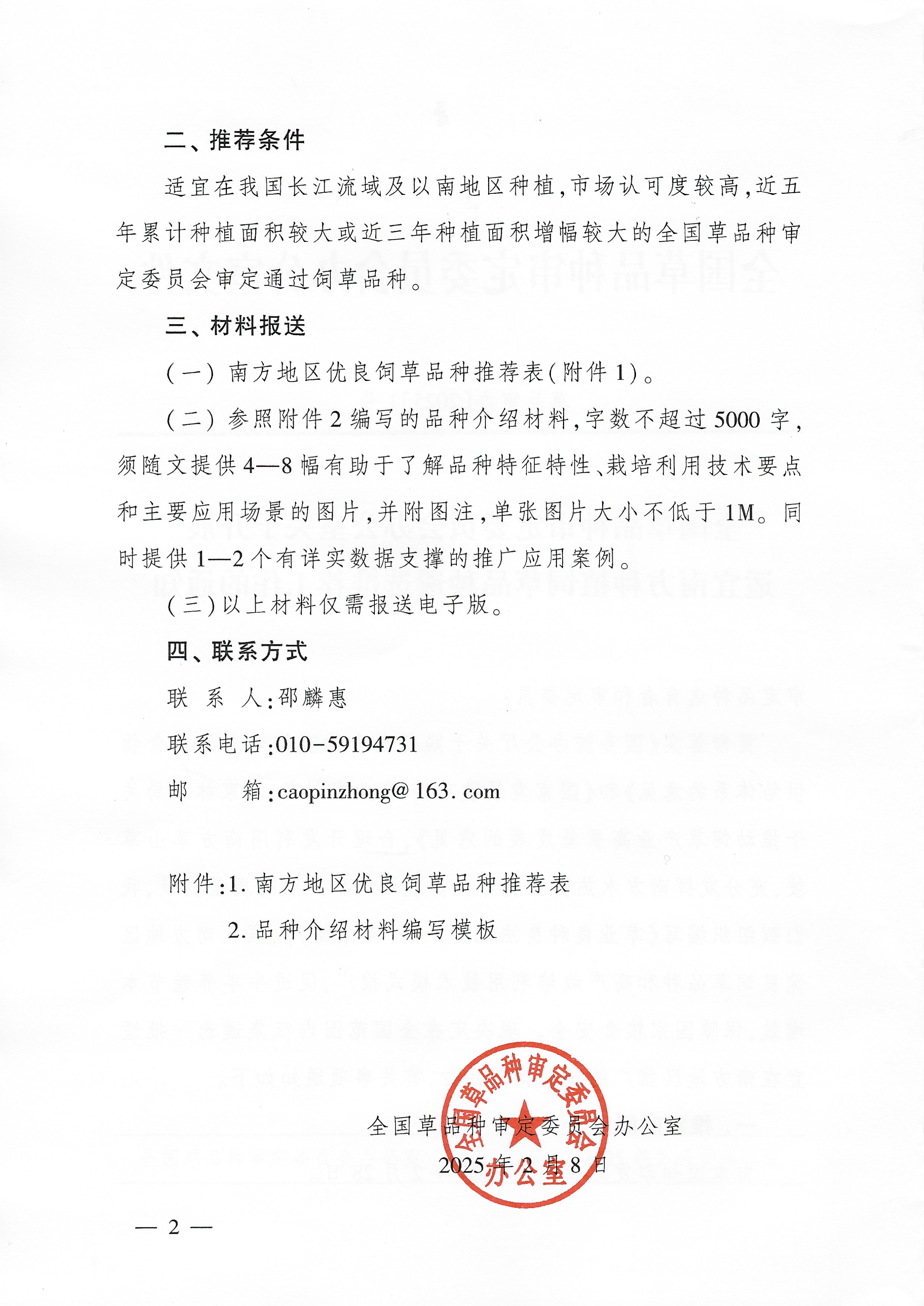 全國草品種審定委員會辦公室關(guān)于開展適宜南方種植飼草品種遴選推薦工作的通知