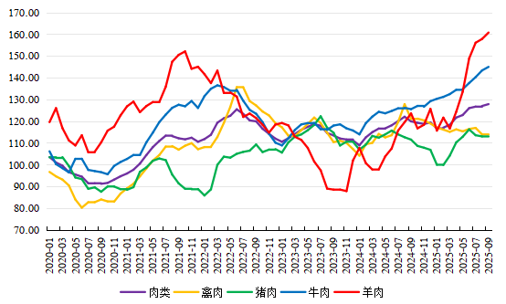 2025年9月份,FAO肉類價格指數小幅上漲,豬肉、牛肉、羊肉、禽肉價格均上漲。FAO肉類價格指數(基期為2014—2016年)2024年1月份降至108.86后反彈,2025年9月份為127.82,環(huán)比漲0.7%,同比漲6.6%。