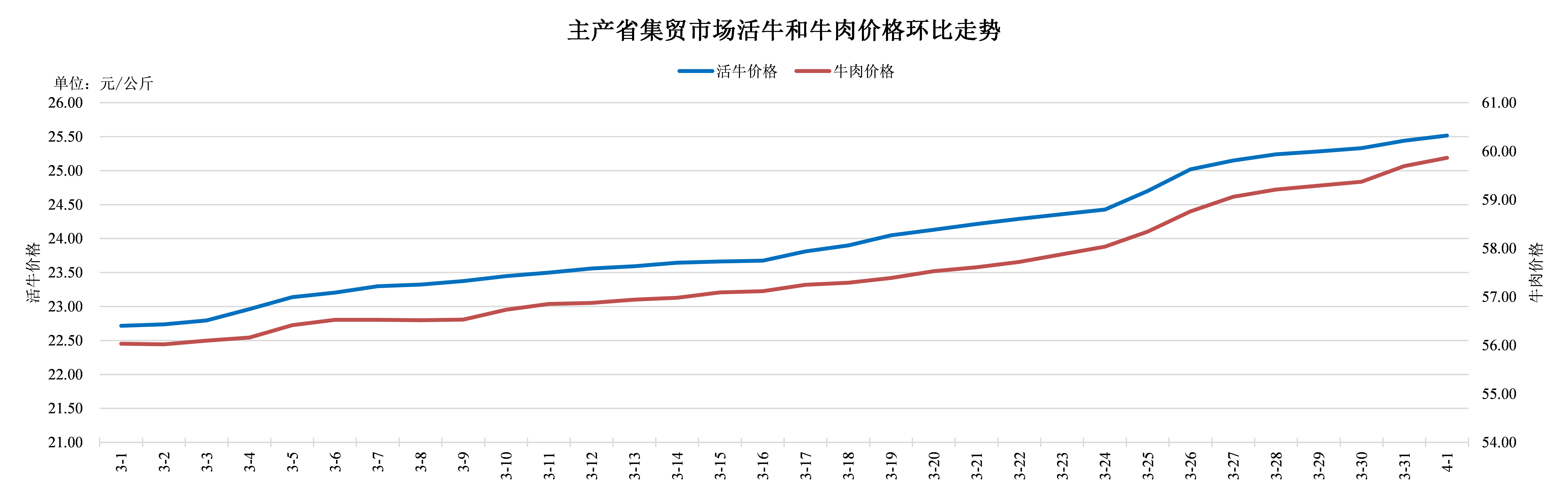 據(jù)農(nóng)業(yè)農(nóng)村部監(jiān)測(cè),2025年4月1日,主產(chǎn)省集貿(mào)市場(chǎng)活牛價(jià)格25.52元/公斤,同比下跌1.1%,環(huán)比上漲0.3%,自3月2日起連續(xù)上漲31天,累計(jì)上漲2.8元,漲幅12.3%;牛肉價(jià)格59.86元/公斤,同比下跌9.6%,環(huán)比上漲0.3%,自3月2日起震蕩上行,累計(jì)上漲3.83元,漲幅6.8%。