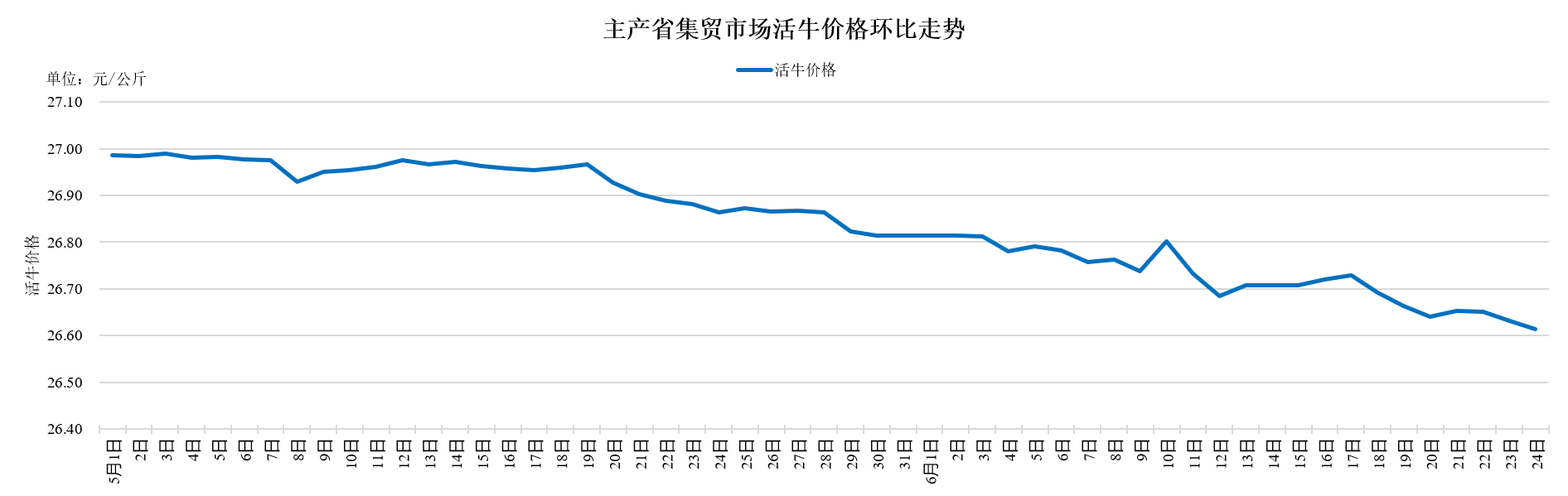 據(jù)農(nóng)業(yè)農(nóng)村部監(jiān)測,2025年6月24日,主產(chǎn)省集貿(mào)市場活牛價(jià)格每公斤26.61元,同比上漲12.9%,環(huán)比下跌0.1%。