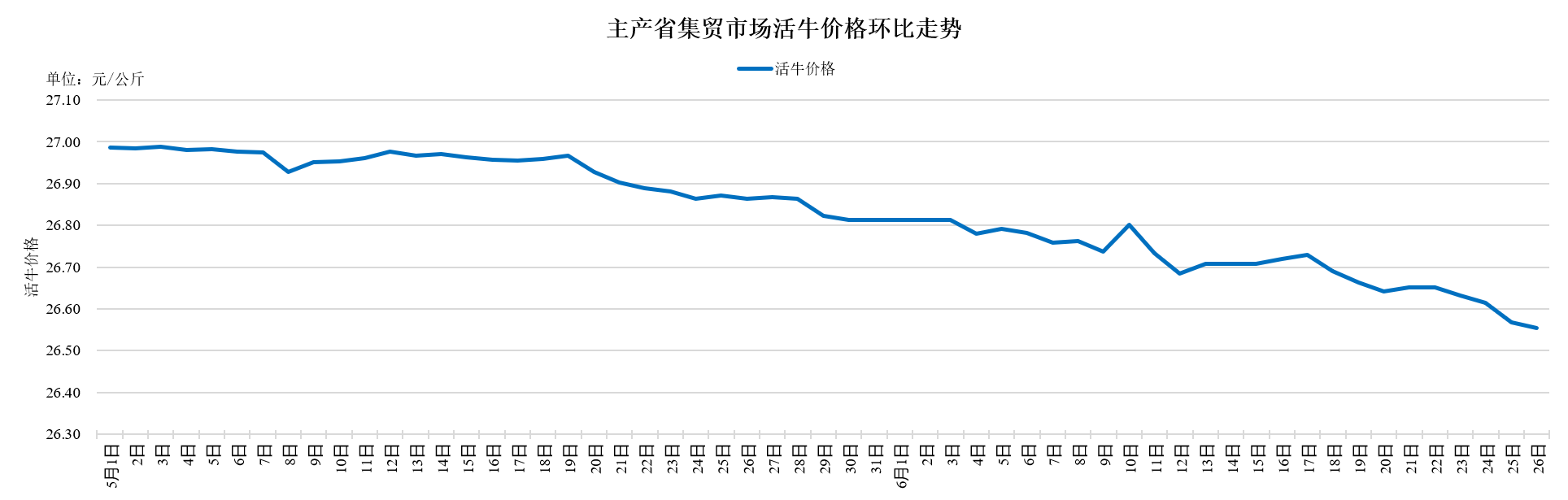 據(jù)農(nóng)業(yè)農(nóng)村部監(jiān)測(cè),2025年6月26日,主產(chǎn)省集貿(mào)市場(chǎng)活牛價(jià)格每公斤26.55元,同比上漲12.6%,環(huán)比持平。