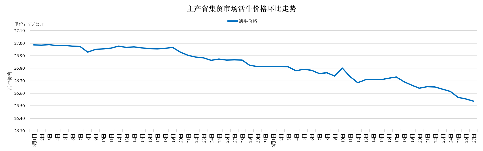 據(jù)農(nóng)業(yè)農(nóng)村部監(jiān)測,2025年6月27日,主產(chǎn)省集貿(mào)市場活牛價格每公斤26.54元,同比上漲12.5%,環(huán)比下跌0.1%。