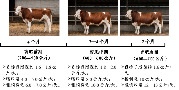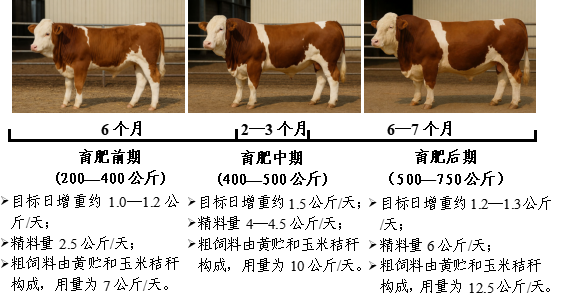 肉牛育肥生產(chǎn)一般是以10—12個(gè)月時(shí)間,將體重約200公斤的架子牛育肥至700公斤左右出欄。養(yǎng)殖場戶為在生長速度、飼料成本與牛肉品質(zhì)間取得平衡,通常采用分階段飼養(yǎng)策略,將育肥周期劃分為三個(gè)階段。育肥前期(約5個(gè)月,體重200—400公斤),重點(diǎn)促進(jìn)骨骼和內(nèi)臟發(fā)育,目標(biāo)日增重1.1—1.3公斤。此階段精飼料用量通常控制在肉牛體重的1.0%—1.2%,日糧粗蛋白水平需達(dá)到14%—16%,綜合凈能水平5.6—6.0兆焦/公斤。育肥中期(約4—5個(gè)月,體重400—600公斤),重點(diǎn)支持肌肉發(fā)育和脂肪沉積,目標(biāo)日增重提升至1.5公斤。精飼料用量逐步增加至體重的1.2%—1.4%,日糧粗蛋白水平可略降至13%—14%,而能量水平提高至6.2—6.6兆焦/公斤。育肥后期(約2—3個(gè)月,體重600—700公斤),為脂肪沉積期,目標(biāo)日增重1.2—1.4公斤。此階段精飼料投入最高,用量可達(dá)體重的1.4%—1.6%,日糧設(shè)計(jì)以高能量為核心,粗蛋白水平約為12%—13%,綜合凈能水平6.8—7.2兆焦/公斤。