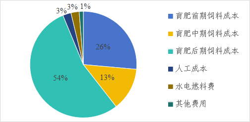 在飼料成本基礎(chǔ)上,附加人工成本300元/頭、水電燃料費(fèi)100元/頭、折舊攤銷300元/頭、金融成本200元/頭,其他費(fèi)用100元/頭,共計(jì)約1000元/頭,合計(jì)全周期總成本約8536元/頭,育肥期公斤增重成本約17.07元。