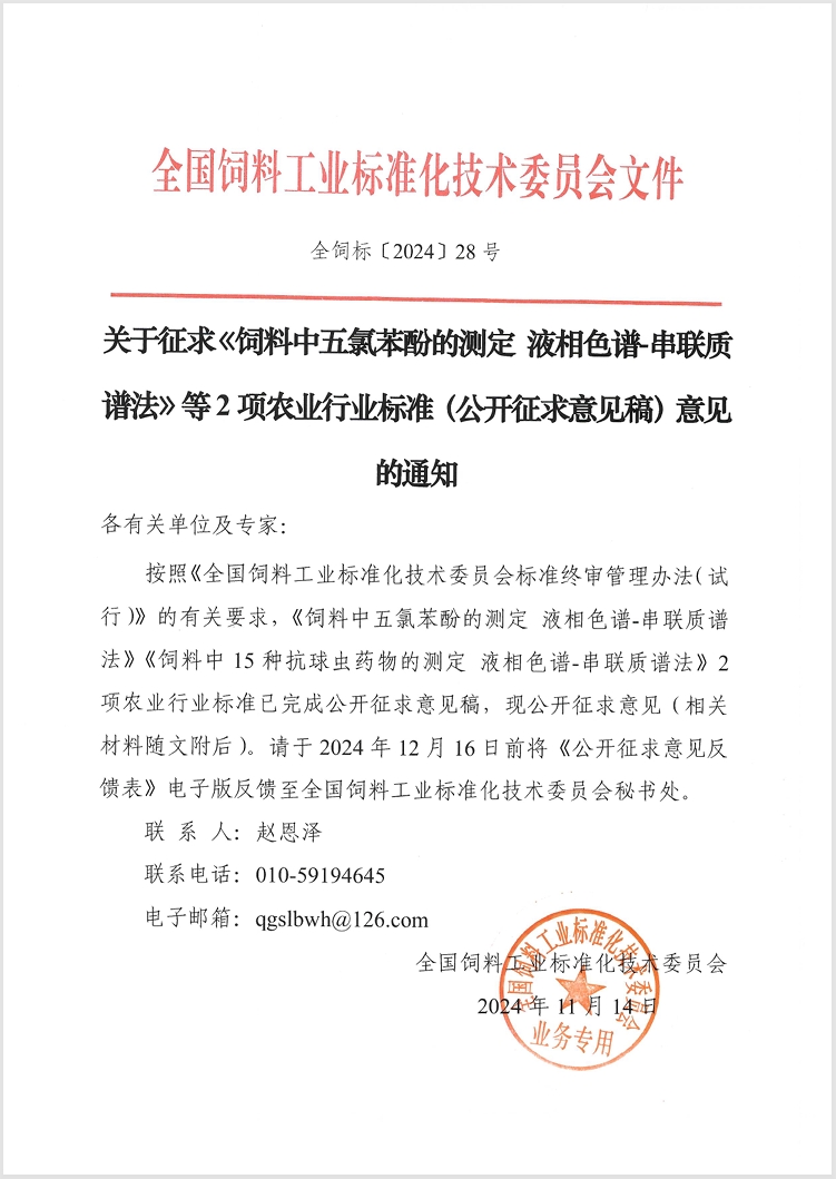 關(guān)于征求《飼料中五氯苯酚的測(cè)定 液相色譜-串聯(lián)質(zhì)譜法》等2項(xiàng)農(nóng)業(yè)行業(yè)標(biāo)準(zhǔn)(公開征求意見稿)意見的通知