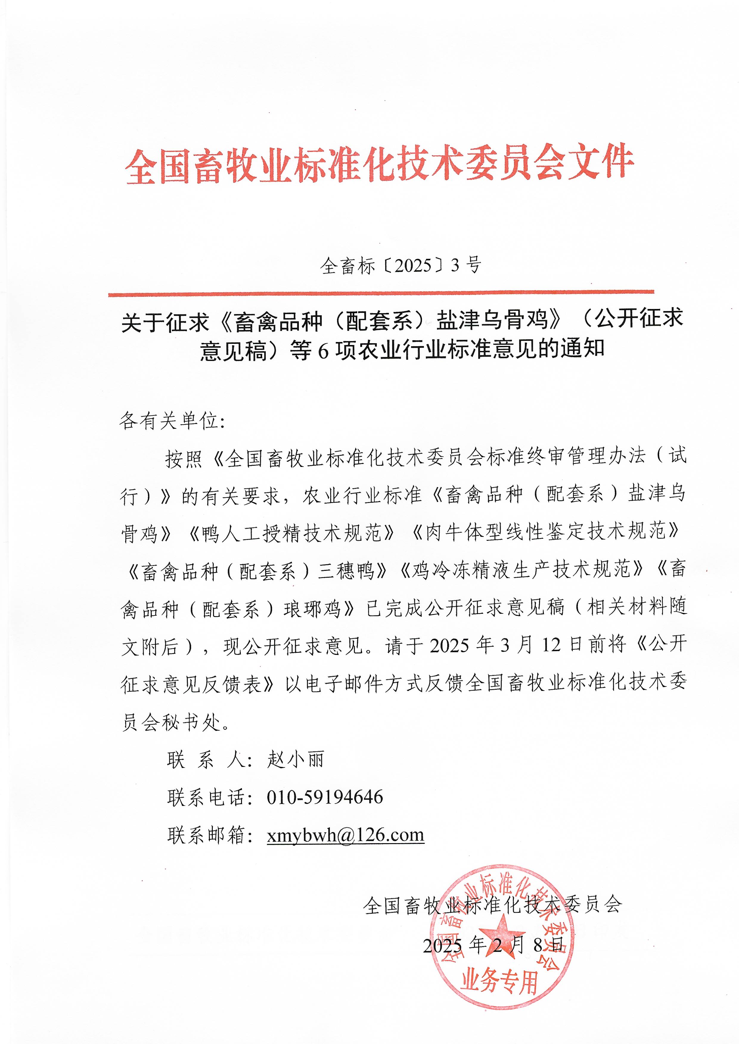 關(guān)于征求《畜禽品種(配套系)鹽津?yàn)豕请u》(公開征求意見稿)等6項(xiàng)農(nóng)業(yè)行業(yè)標(biāo)準(zhǔn)意見的通知