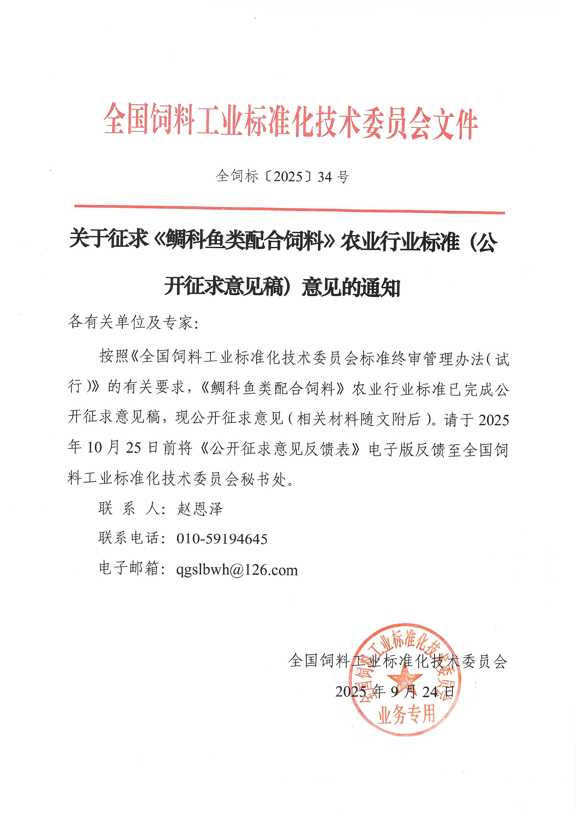 關(guān)于征求《鯛科魚類配合飼料》農(nóng)業(yè)行業(yè)標(biāo)準(zhǔn)(公開征求意見稿)意見的通知