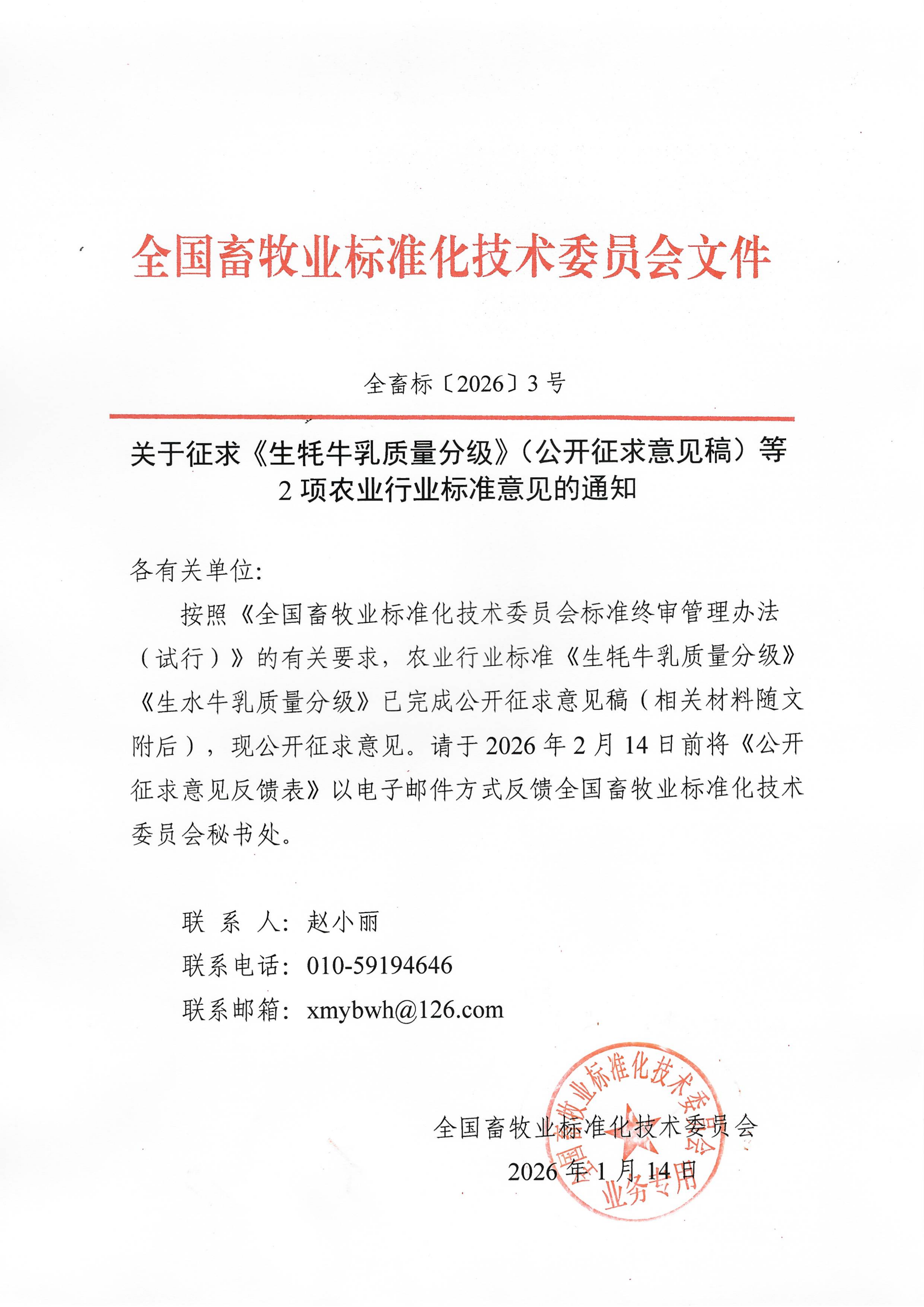 關(guān)于征求《生牦牛乳質(zhì)量分級(jí)》(公開征求意見稿)等2項(xiàng)農(nóng)業(yè)行業(yè)標(biāo)準(zhǔn)意見的通知