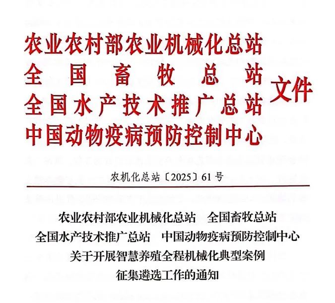 為貫徹落實(shí)《農(nóng)業(yè)農(nóng)村部關(guān)于大力發(fā)展智慧農(nóng)業(yè)的指導(dǎo)意見》《農(nóng)業(yè)農(nóng)村部關(guān)于實(shí)施養(yǎng)殖業(yè)節(jié)糧行動(dòng)的意見》《農(nóng)業(yè)農(nóng)村部關(guān)于加快畜牧業(yè)機(jī)械化發(fā)展的意見》《農(nóng)業(yè)農(nóng)村部關(guān)于加快水產(chǎn)養(yǎng)殖機(jī)械化發(fā)展的意見》等有關(guān)部署要求,推廣一批智慧農(nóng)業(yè)成熟技術(shù)裝備和集成應(yīng)用模式,培育一批高水平的智慧牧場、智慧漁場,推動(dòng)智能化標(biāo)準(zhǔn)化養(yǎng)殖設(shè)施裝備集成配套,促進(jìn)智慧農(nóng)業(yè)技術(shù)裝備創(chuàng)新應(yīng)用,推進(jìn)畜牧養(yǎng)殖智慧化、漁業(yè)生產(chǎn)智能化,農(nóng)業(yè)農(nóng)村部農(nóng)業(yè)機(jī)械化總站、全國畜牧總站、全國水產(chǎn)技術(shù)推廣總站、中國動(dòng)物疫病預(yù)防控制中心(以下簡稱總站、中心)決定聯(lián)合開展智慧養(yǎng)殖全程機(jī)械化典型案例征集遴選工作,圍繞“先進(jìn)適用 綠色智能”主題,挖掘總結(jié)、宣傳推廣一批智慧養(yǎng)殖全程機(jī)械化成功經(jīng)驗(yàn)和做法,發(fā)揮典型示范引領(lǐng)作用,促進(jìn)養(yǎng)殖業(yè)高質(zhì)量發(fā)展?,F(xiàn)就有關(guān)事項(xiàng)通知如下。