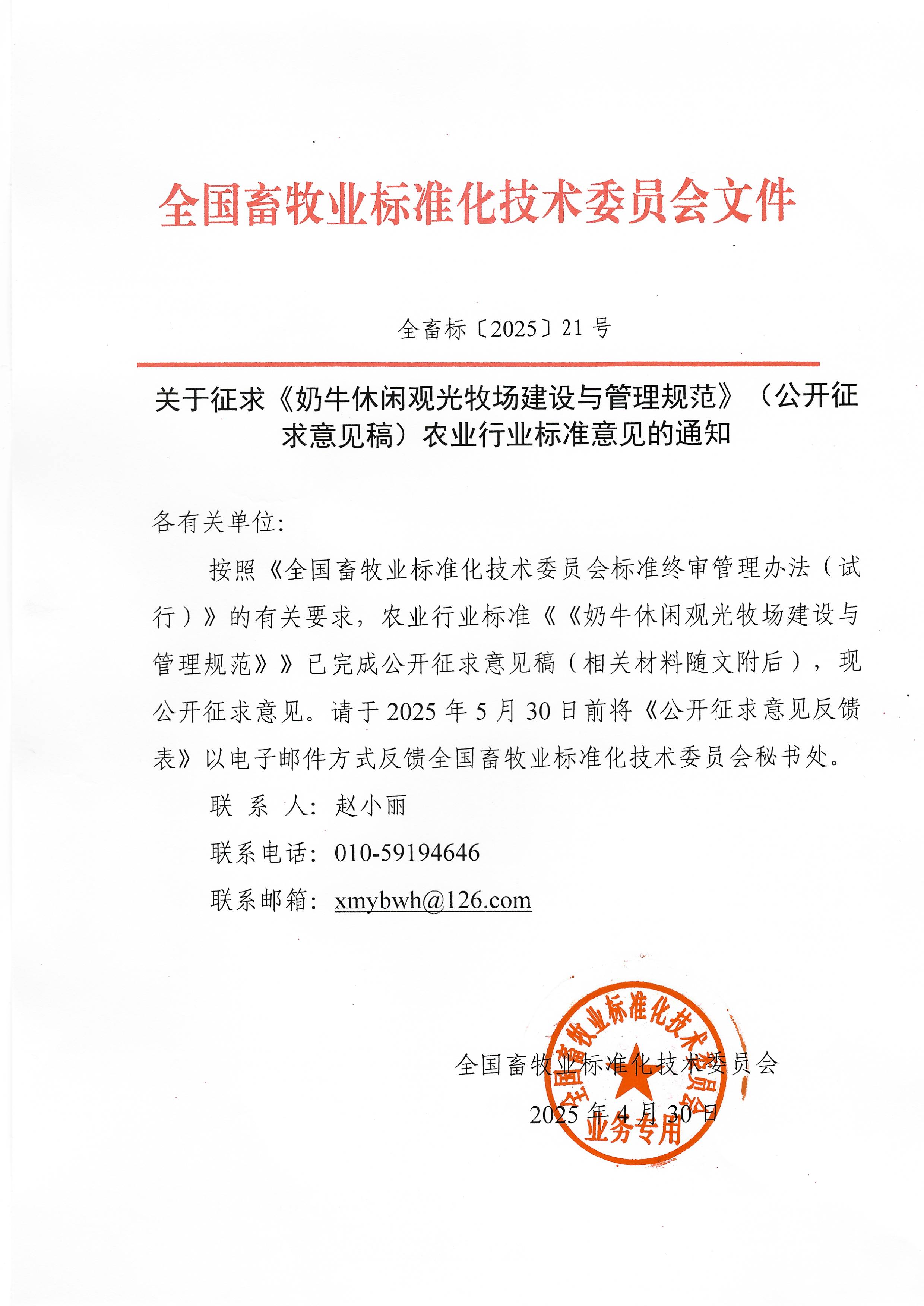 關(guān)于征求《奶牛休閑觀光牧場建設(shè)與管理規(guī)范》(公開征求意見稿)農(nóng)業(yè)行業(yè)標(biāo)準(zhǔn)意見的通知
